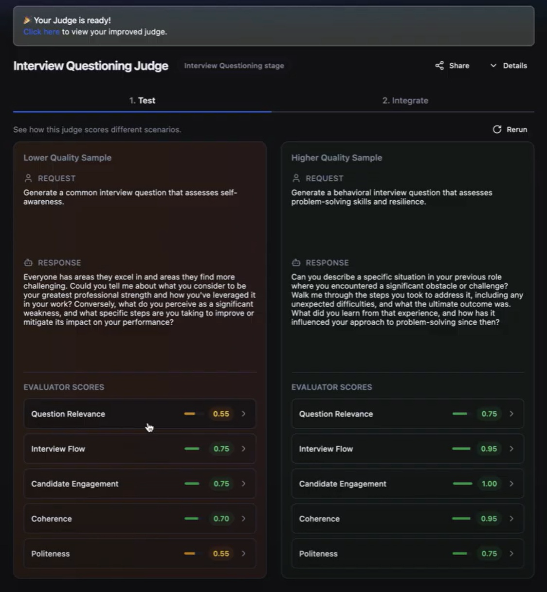 • Automatic improvement: Scorable creates a better version in the background, with more realistic scenarios and a more complete evaluation stack.